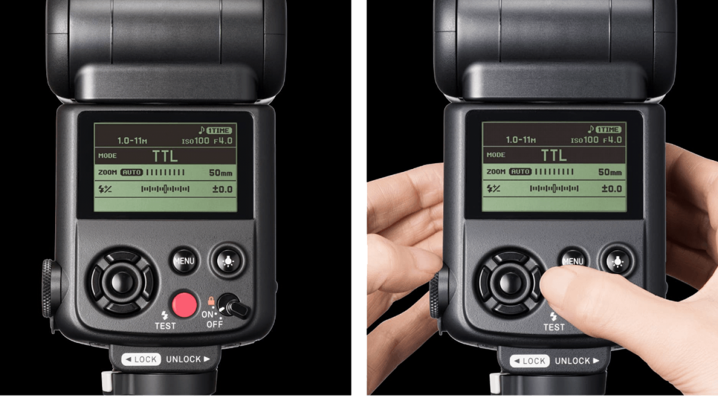 Das neue Dot-Matrix-Flüssigkristall-Display ist in diesem Blitzgerät integriert. Darüber hinaus machen das D-Pad und das Einstellrad an der Seite des Blitzgeräts das Ändern von Einstellungen wie TTL-Belichtungsautomatik, drahtloses Blitzen, FP-Blitz und Synchronisation auf den hinteren Vorhang auf dem Hauptbildschirm und im Setup-Menü auf dem LCD-Display einfacher als je zuvor. Der Blitz lässt sich mit einem Klick auf den Blitzschuhverriegelungshebel leicht auslösen. Ein Blitzsynchronisationsanschluss und ein Signalton, der anzeigt, wenn das Blitzgerät vollständig aufgeladen ist, sorgen für noch mehr Benutzerfreundlichkeit.