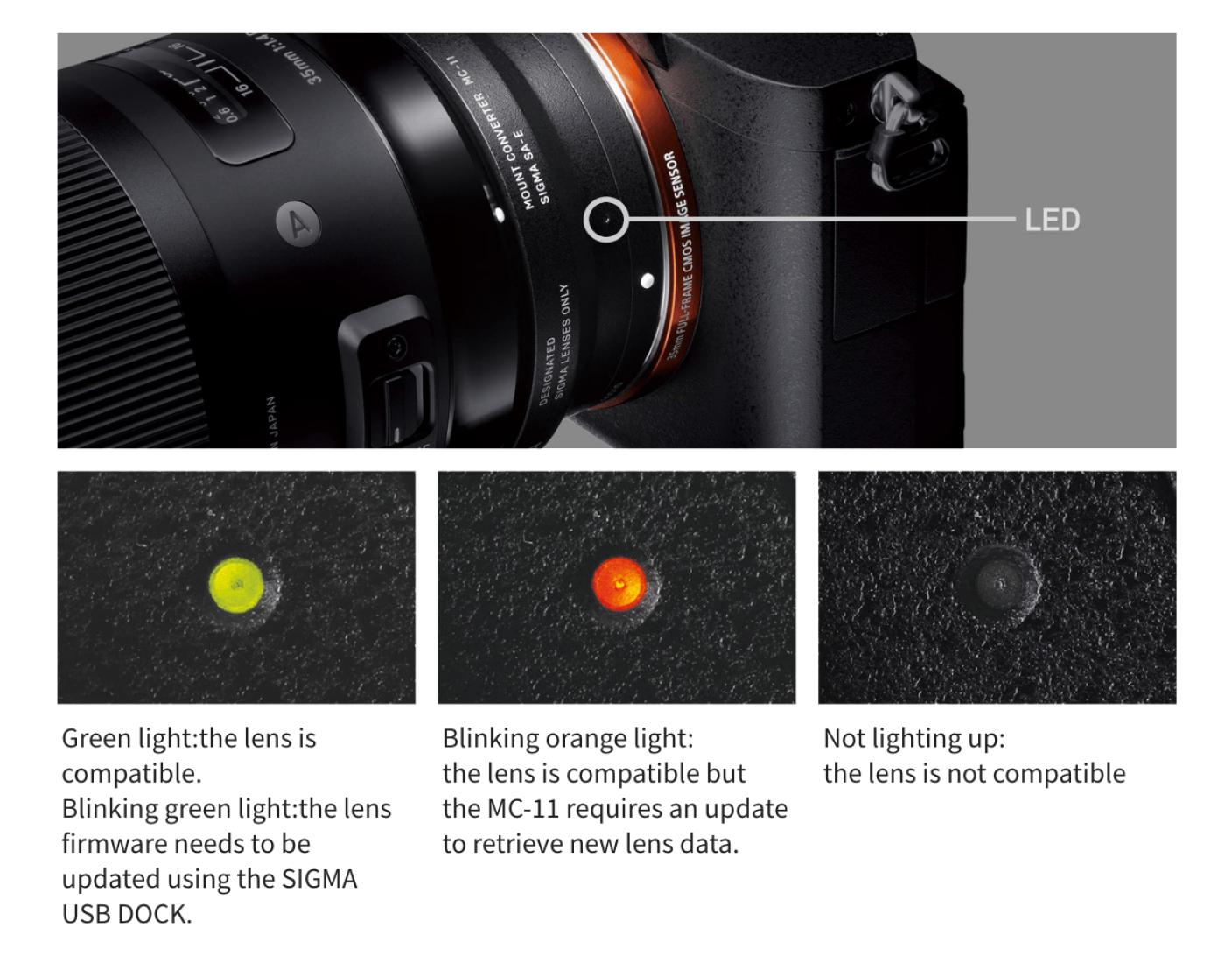 Anhand der LED-Anzeige des MOUNT CONVERTER MC-11 lässt sich leicht erkennen, ob ein angebrachtes Objektiv kompatibel ist oder nicht und ob die mount converter Steuerdaten für den Betrieb mit diesem Objektiv aktualisiert werden müssen.