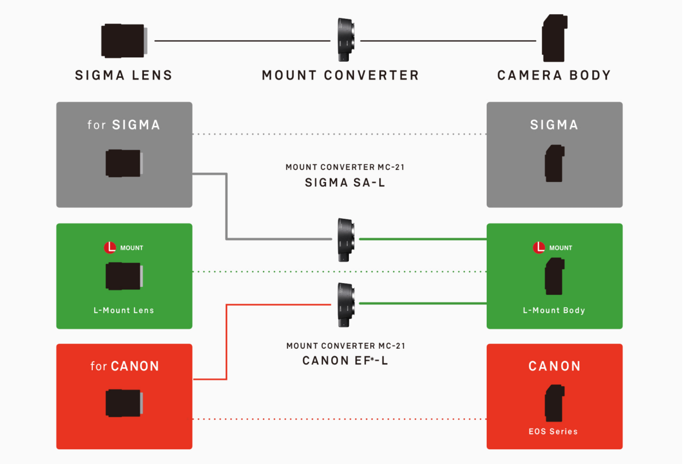 Der Sigma MOUNT CONVERTER MC-21 ermöglicht Sigma es Besitzern von Sigma Wechselobjektiven mit SA-Mount und 's CANON EF-Mount, ihre Objektive an L-Mount-Kameragehäusen zu verwenden. Der Konverter ermöglicht eine grössere Wahlfreiheit für L-Mount-Kameras und verbessert die Erweiterbarkeit des L-Mount-Systems.