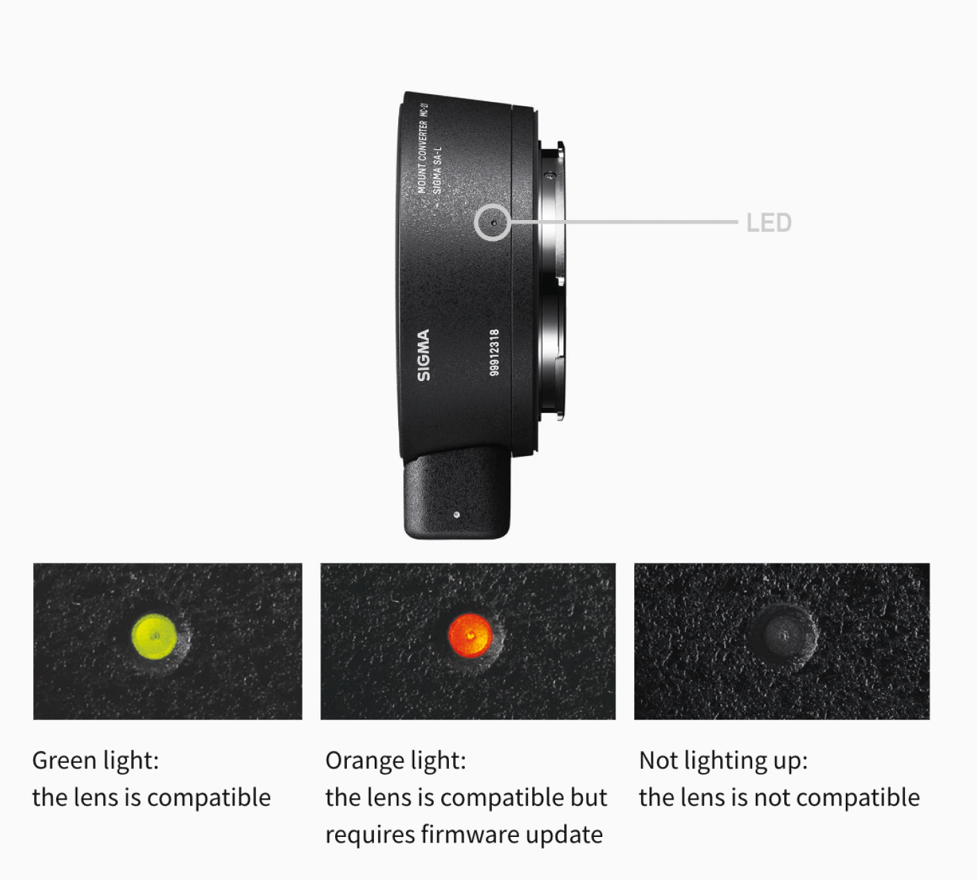 Ob das montierte Objektiv kompatibel ist oder nicht, lässt sich sofort an der Farbe und dem Ein- und Ausschalten der im MC-21 integrierten LED erkennen. Die LED informiert den Benutzer auch, wenn ein Objektiv-Firmware-Update verfügbar ist.