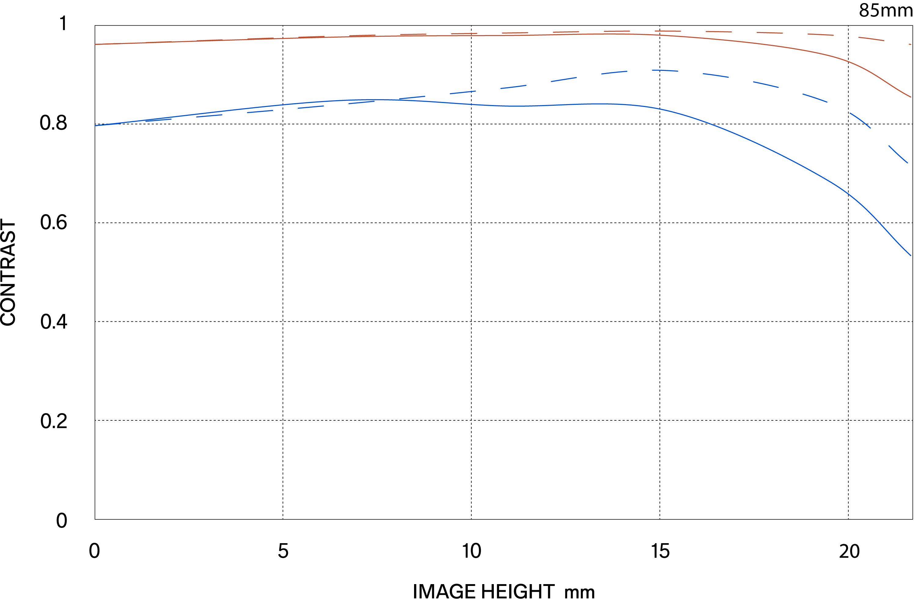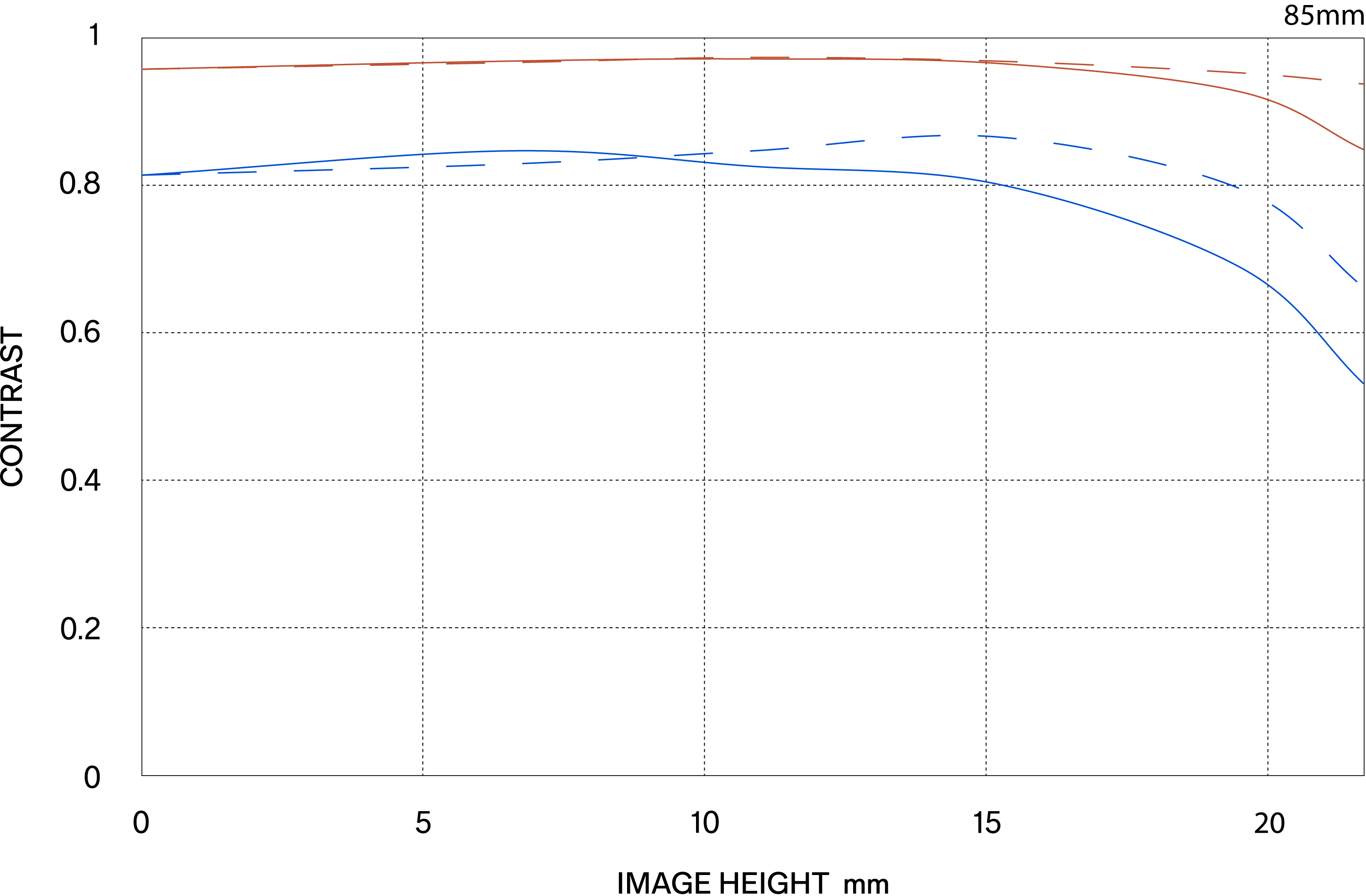 The MTF (Modulation Transfer Function) is one of the measurements for evaluating a lens’ performance, and it shows how faithfully the contrast of the subject can be reproduced on the image plane. The horizontal axis shows the image height (distance from the center of the image in mm) and the vertical axis shows the contrast value (maximum value is 1).