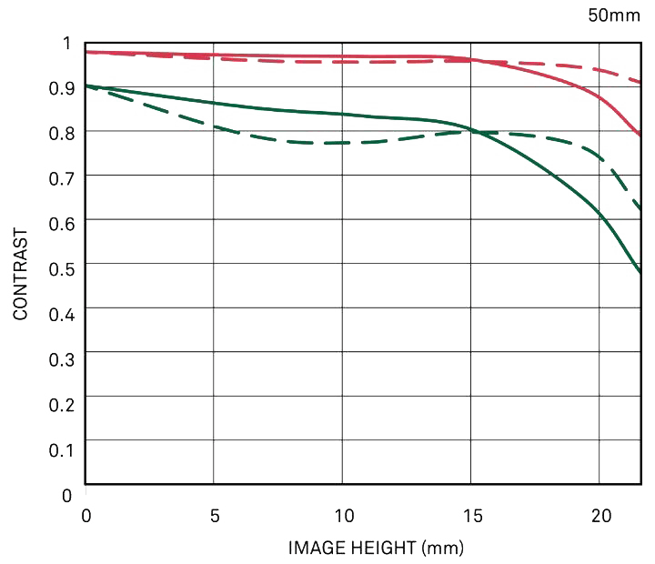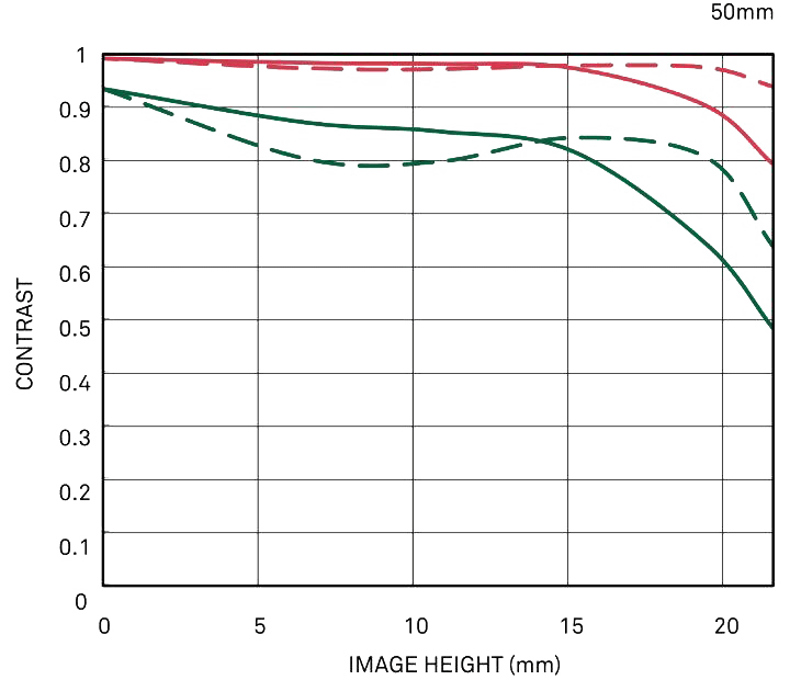 The MTF (Modulation Transfer Function) is one of the measurements for evaluating a lens’ performance, and it shows how faithfully the contrast of the subject can be reproduced on the image plane. The horizontal axis shows the image height (distance from the center of the image in mm) and the vertical axis shows the contrast value (maximum value is 1).