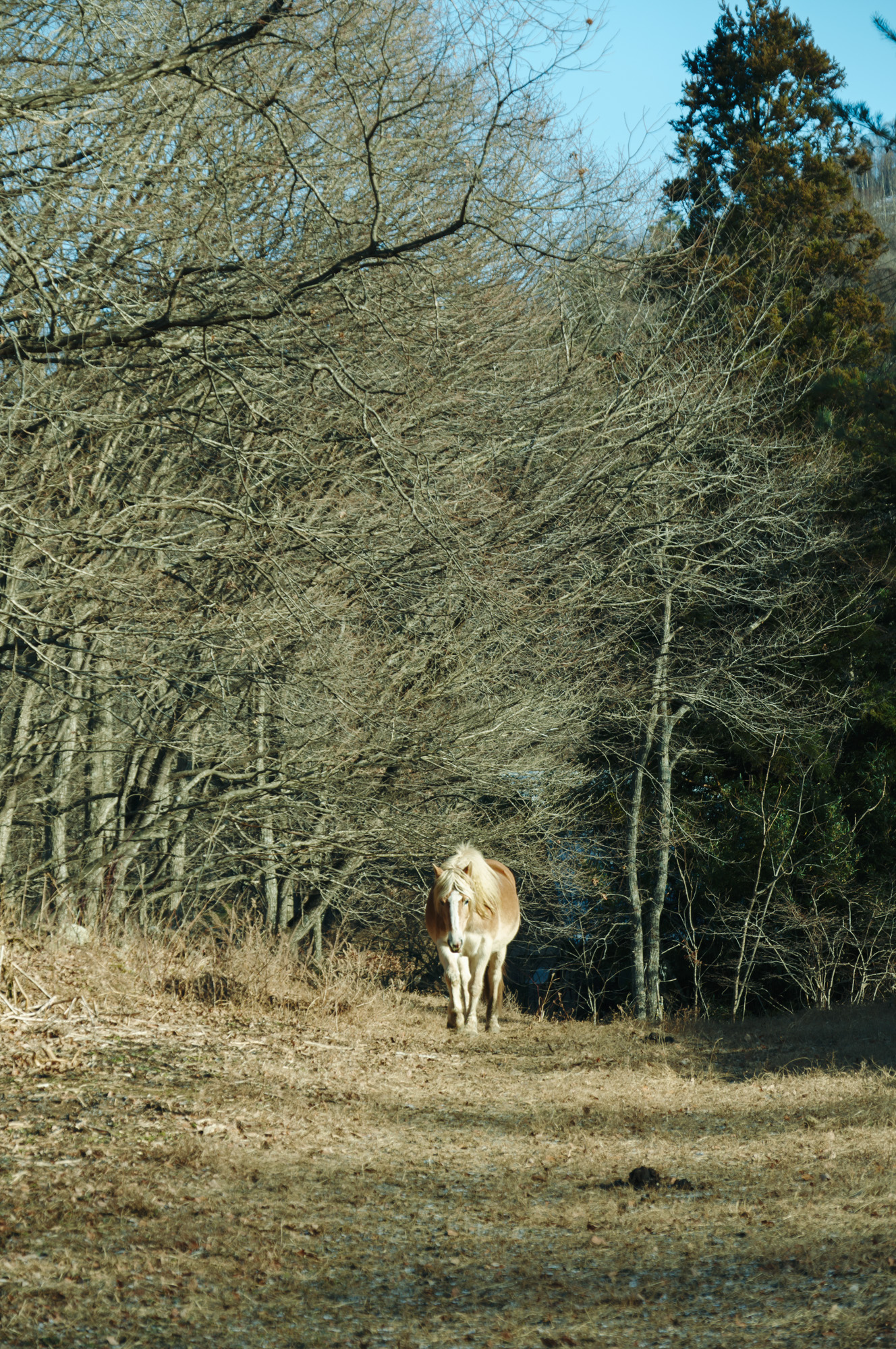 There is a group of horses living in this forest. Three mares, two stallions. As I bow to greet them, one of them begins to nibble at my hat. A beautiful, strong horse, colored in a shade called obana chestnut, named after Japanese silvergrass. In fact, its long tail, swaying with each step, reminds me of silvergrass waving in the wind.