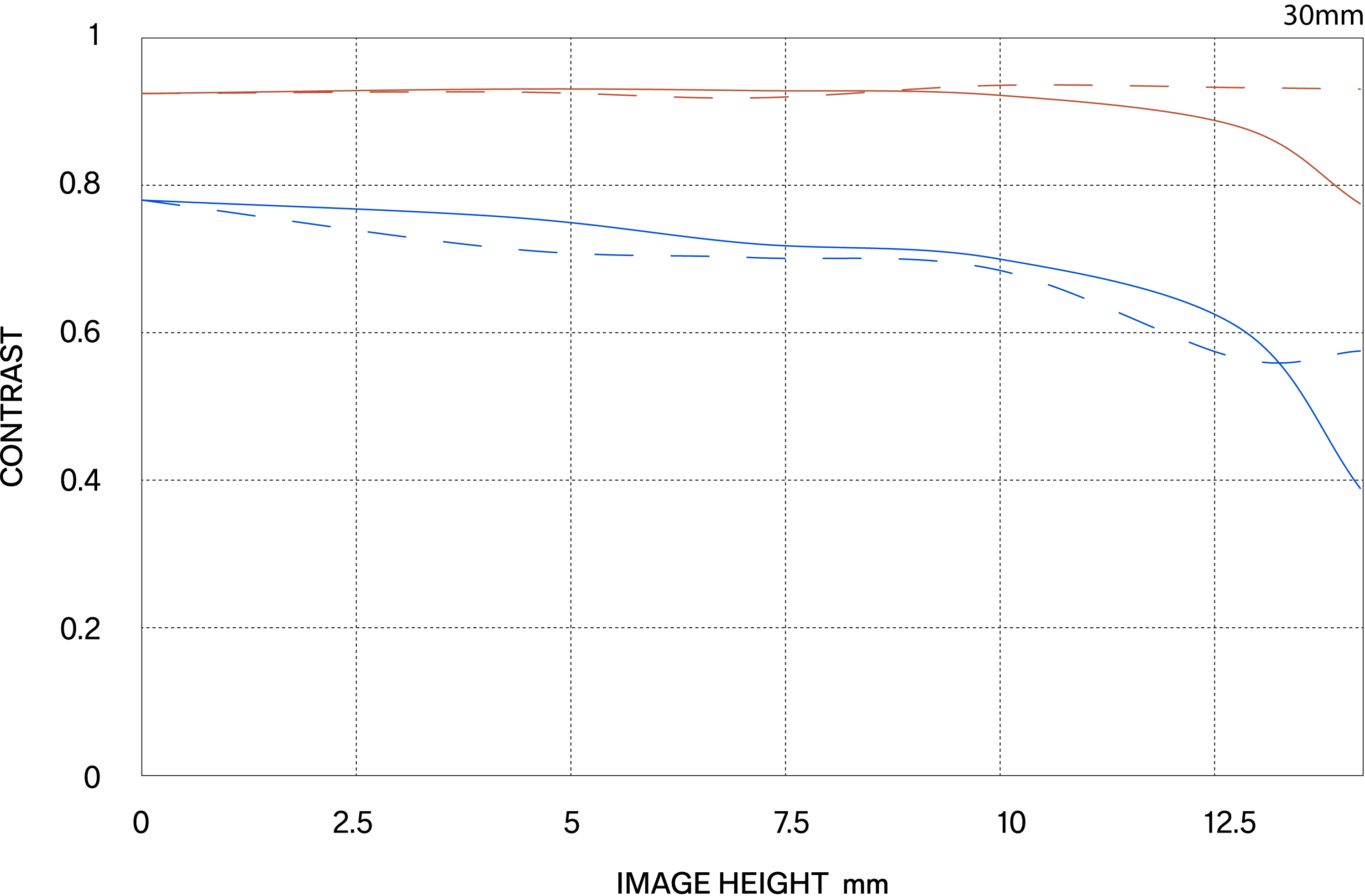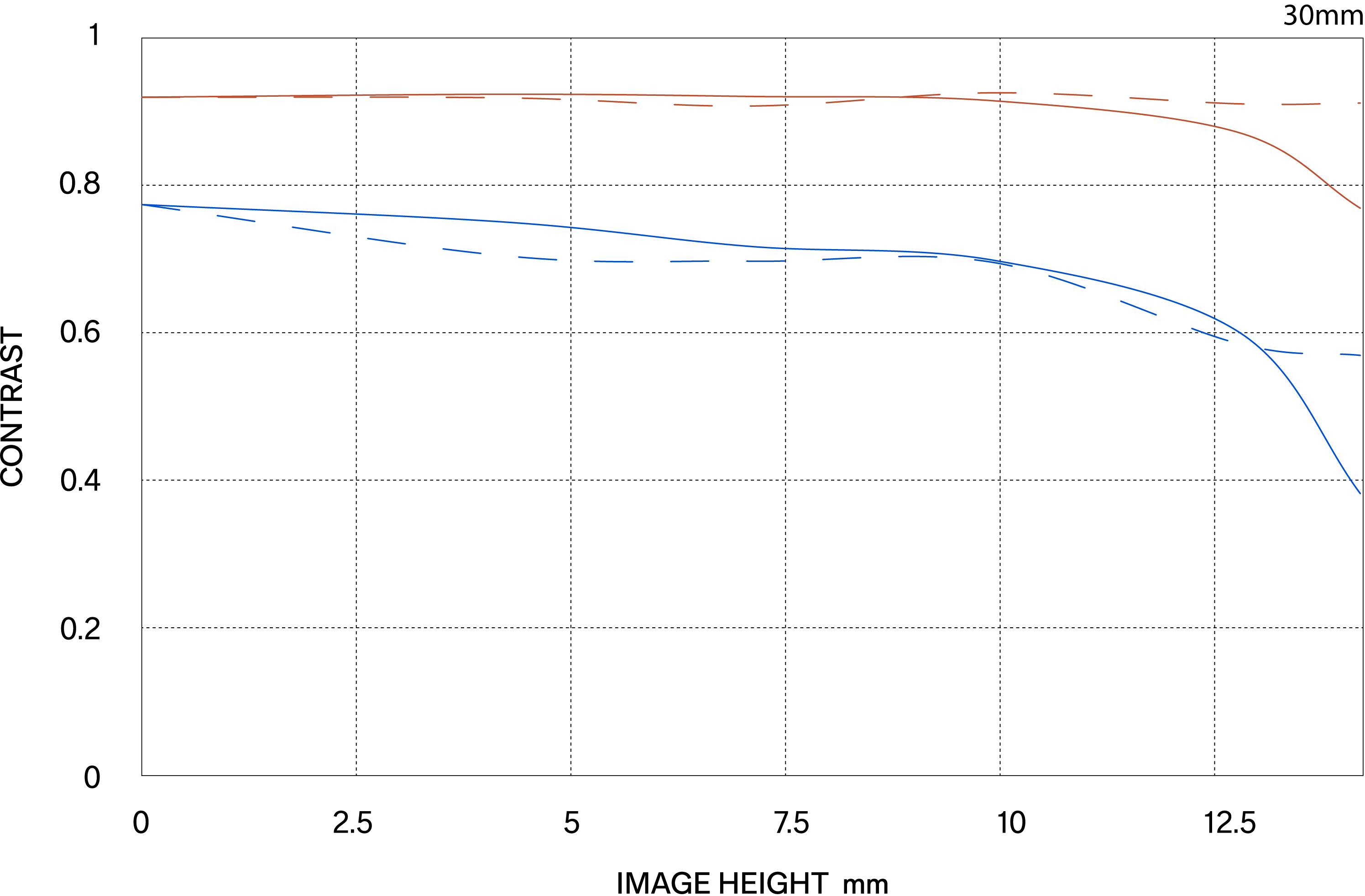 The closer the 10 line pairs/mm curve is to 1, the higher the contrast and clarity of the lens is, and similarly, the closer the 30 line pairs/mm curve is to 1, the better the resolution and sharpness of the lens is.