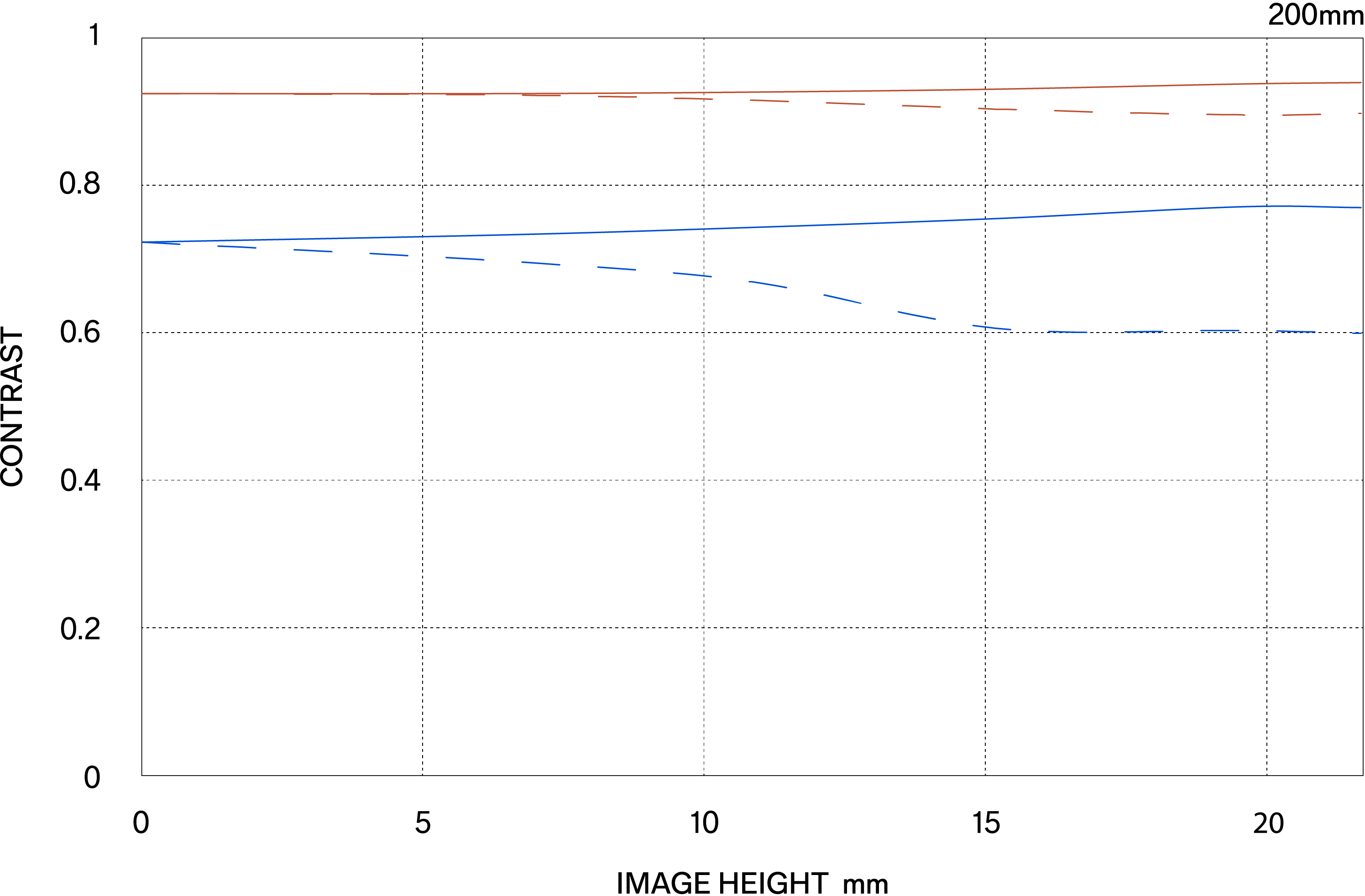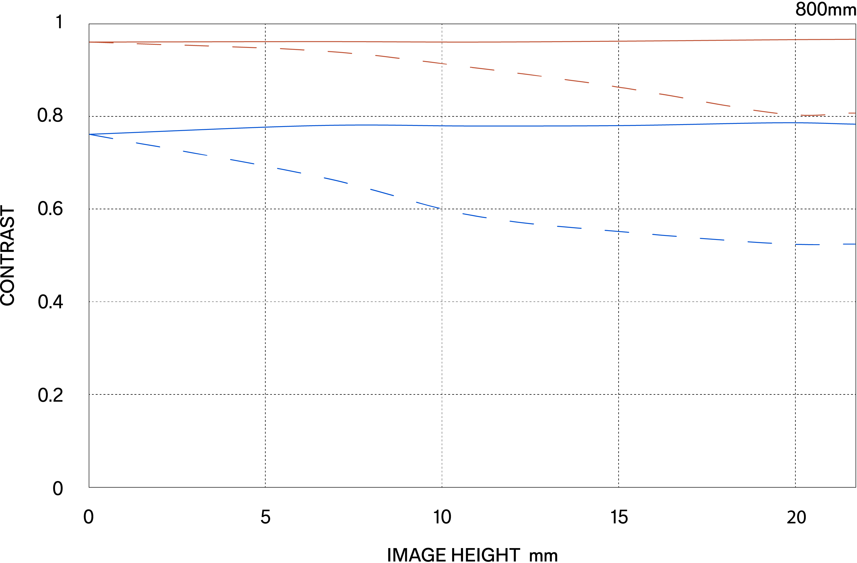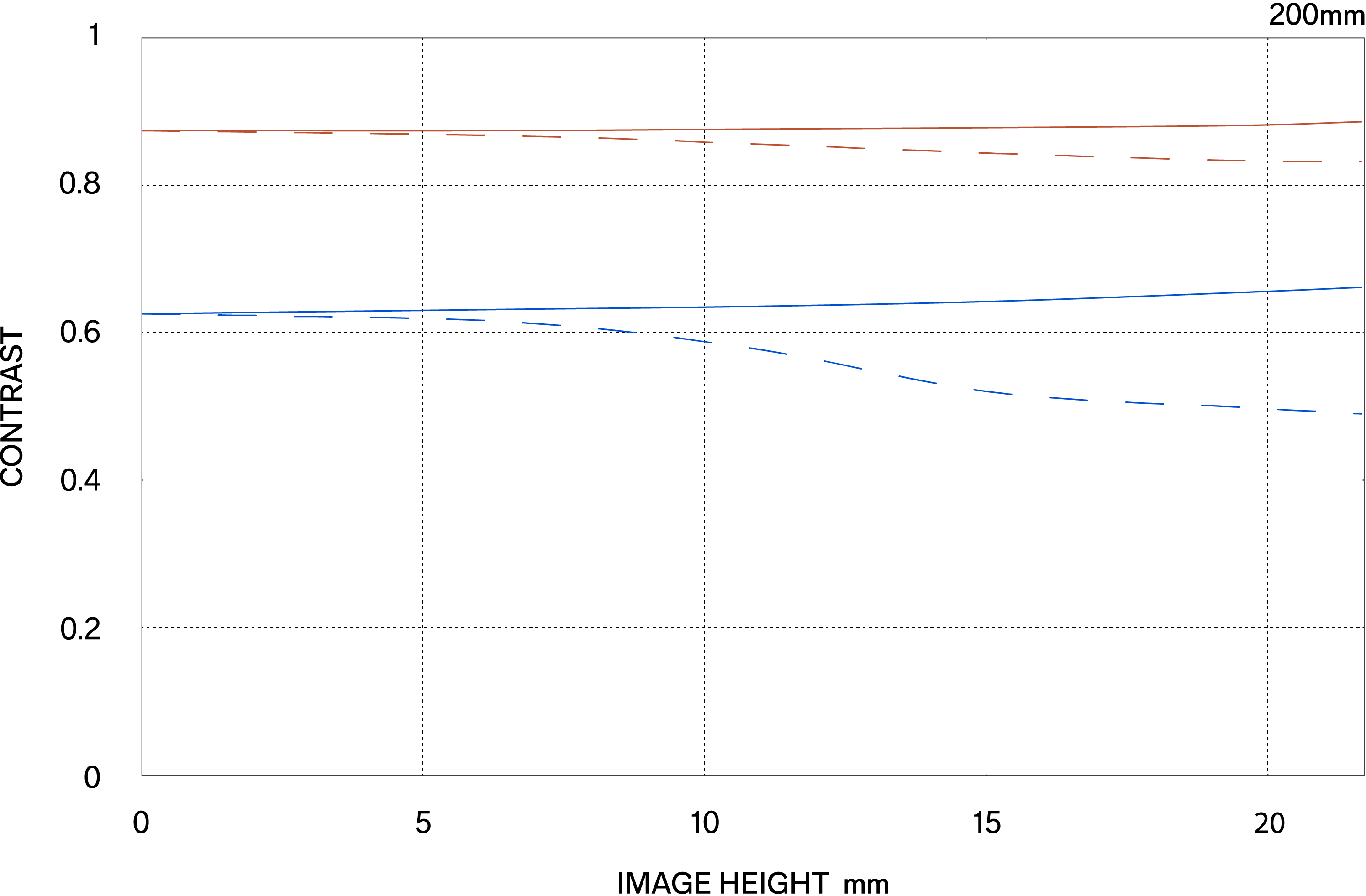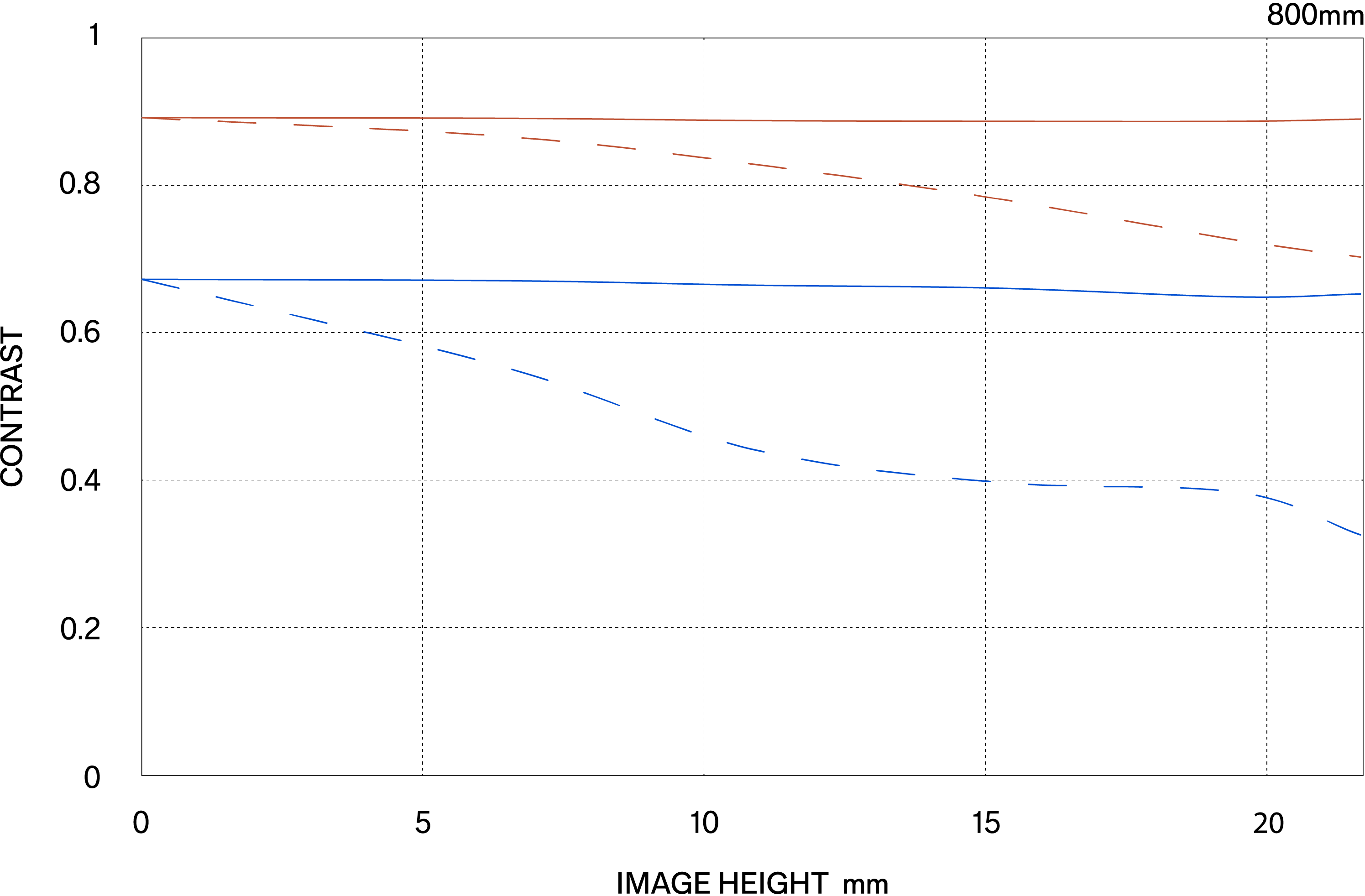 The MTF (Modulation Transfer Function) is one of the measurements for evaluating a lens’ performance, and it shows how faithfully the contrast of the subject can be reproduced on the image plane. The horizontal axis shows the image height (distance from the center of the image in mm) and the vertical axis shows the contrast value (maximum value is 1).