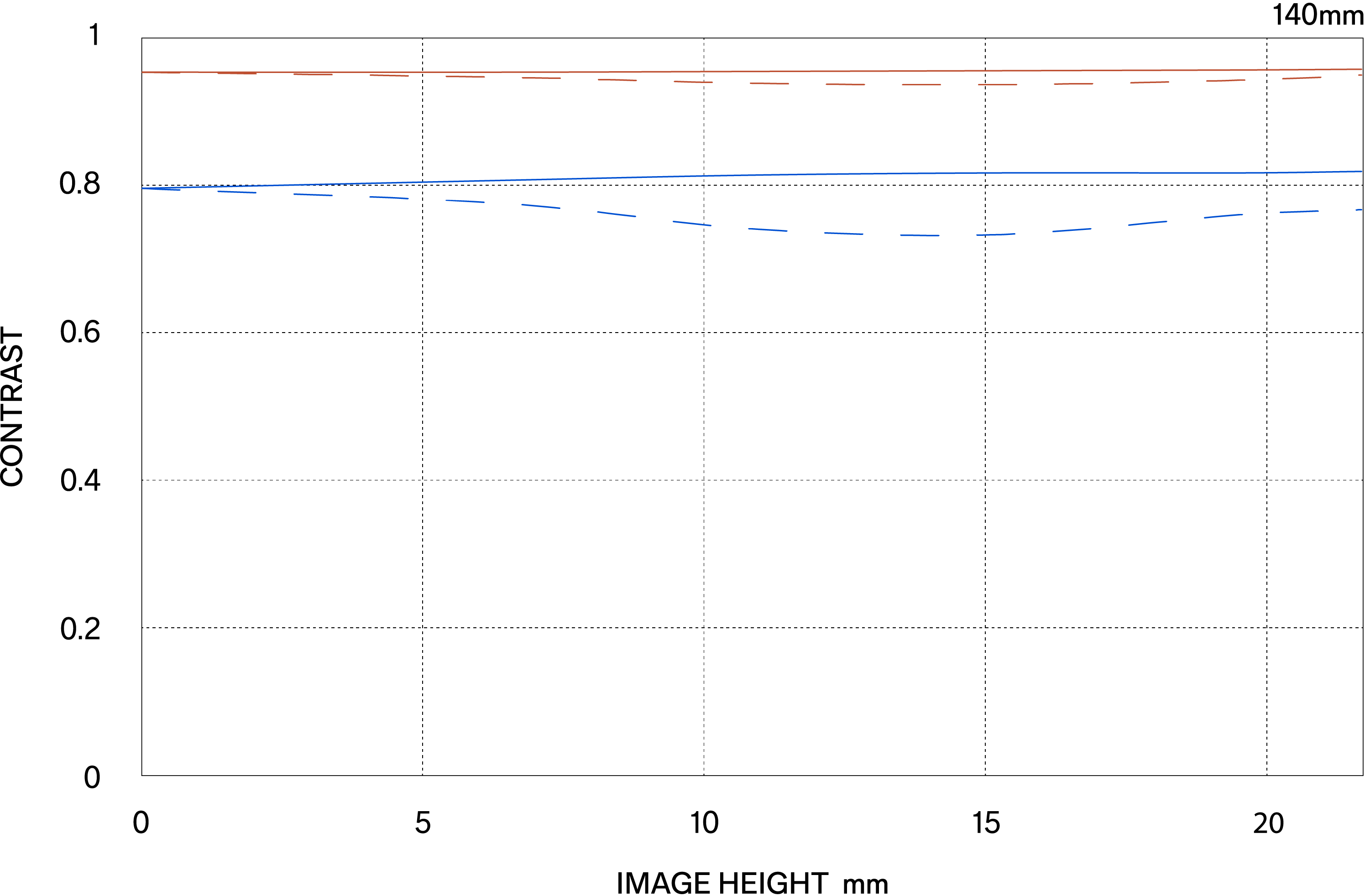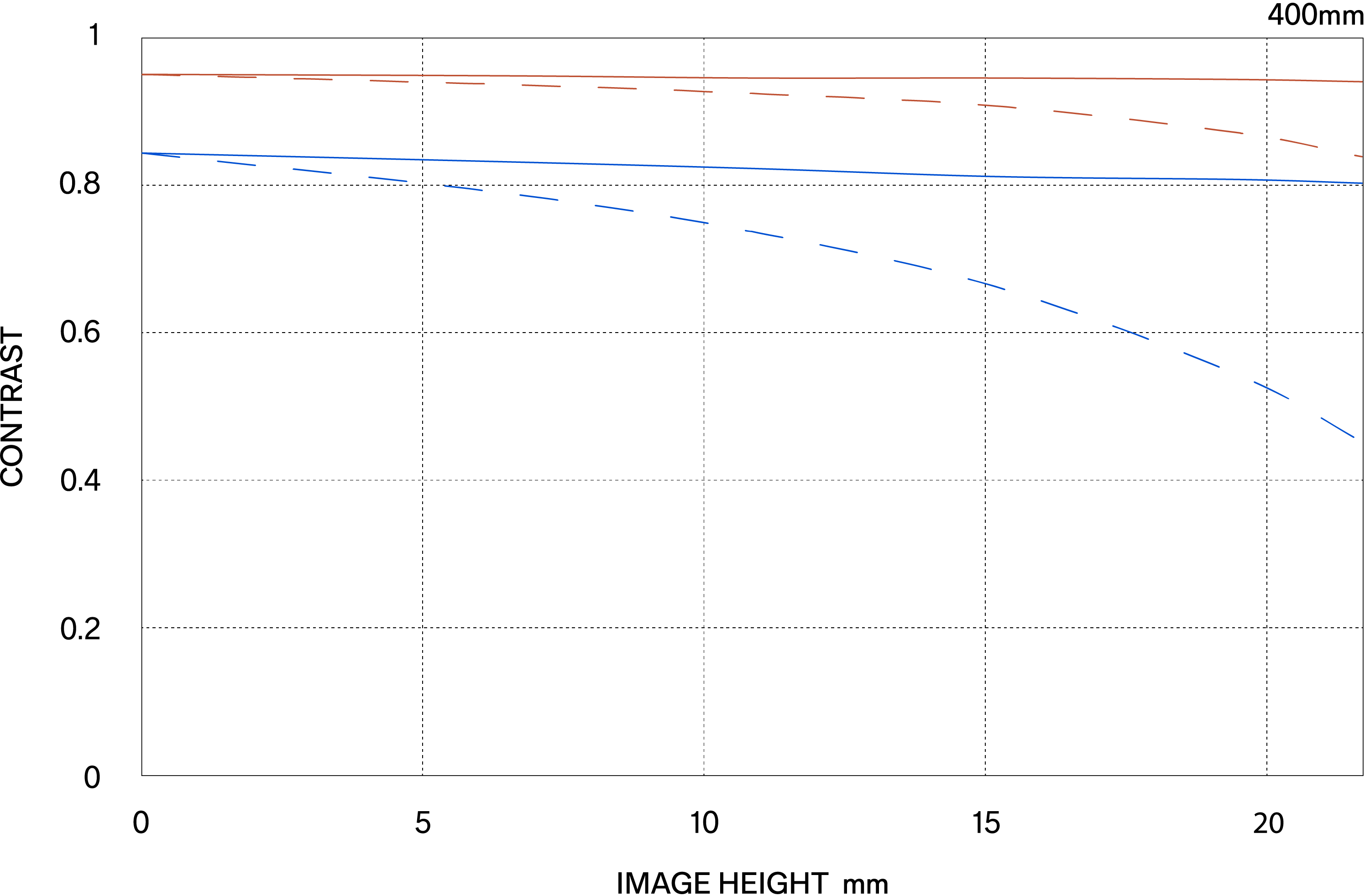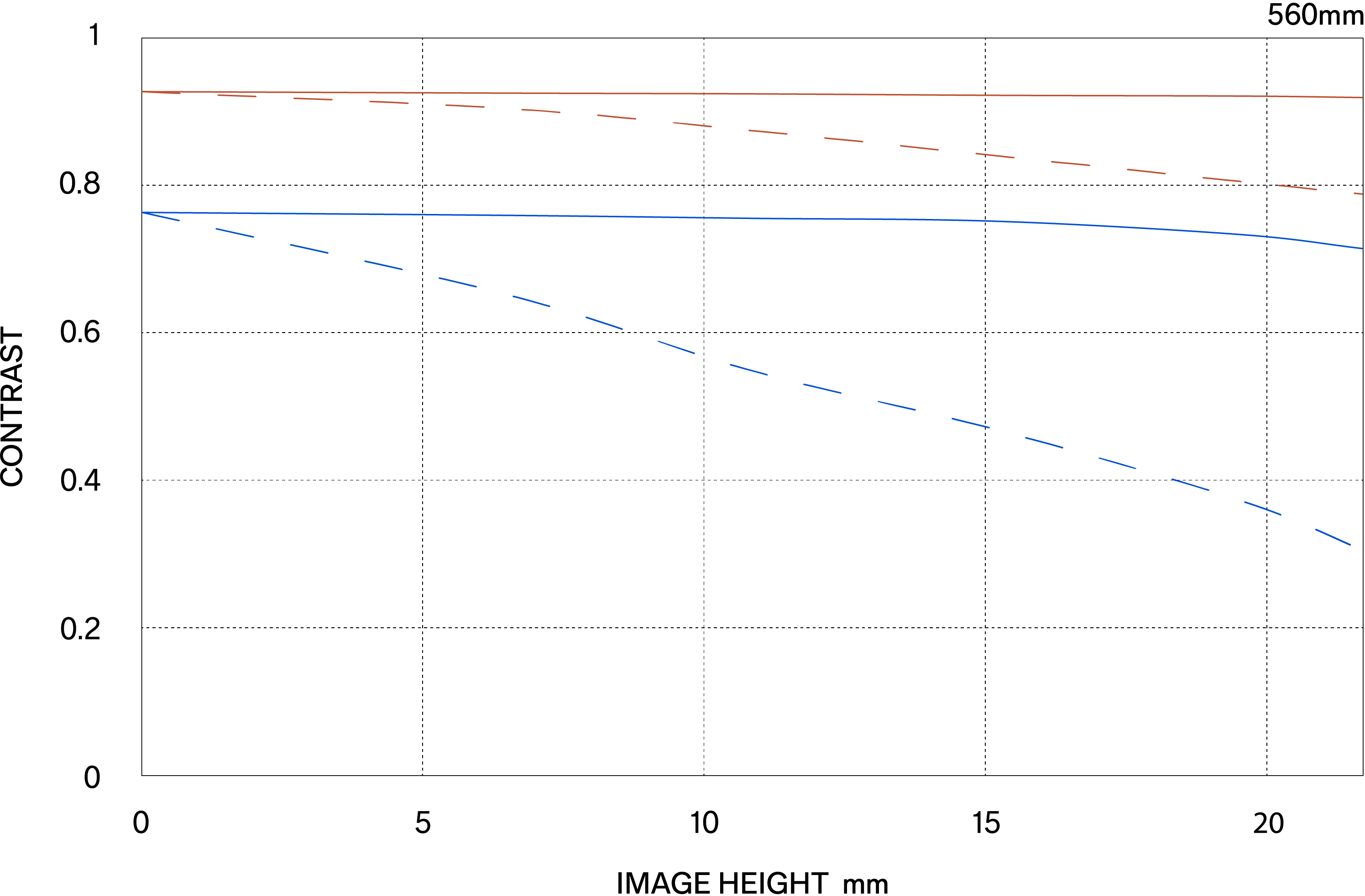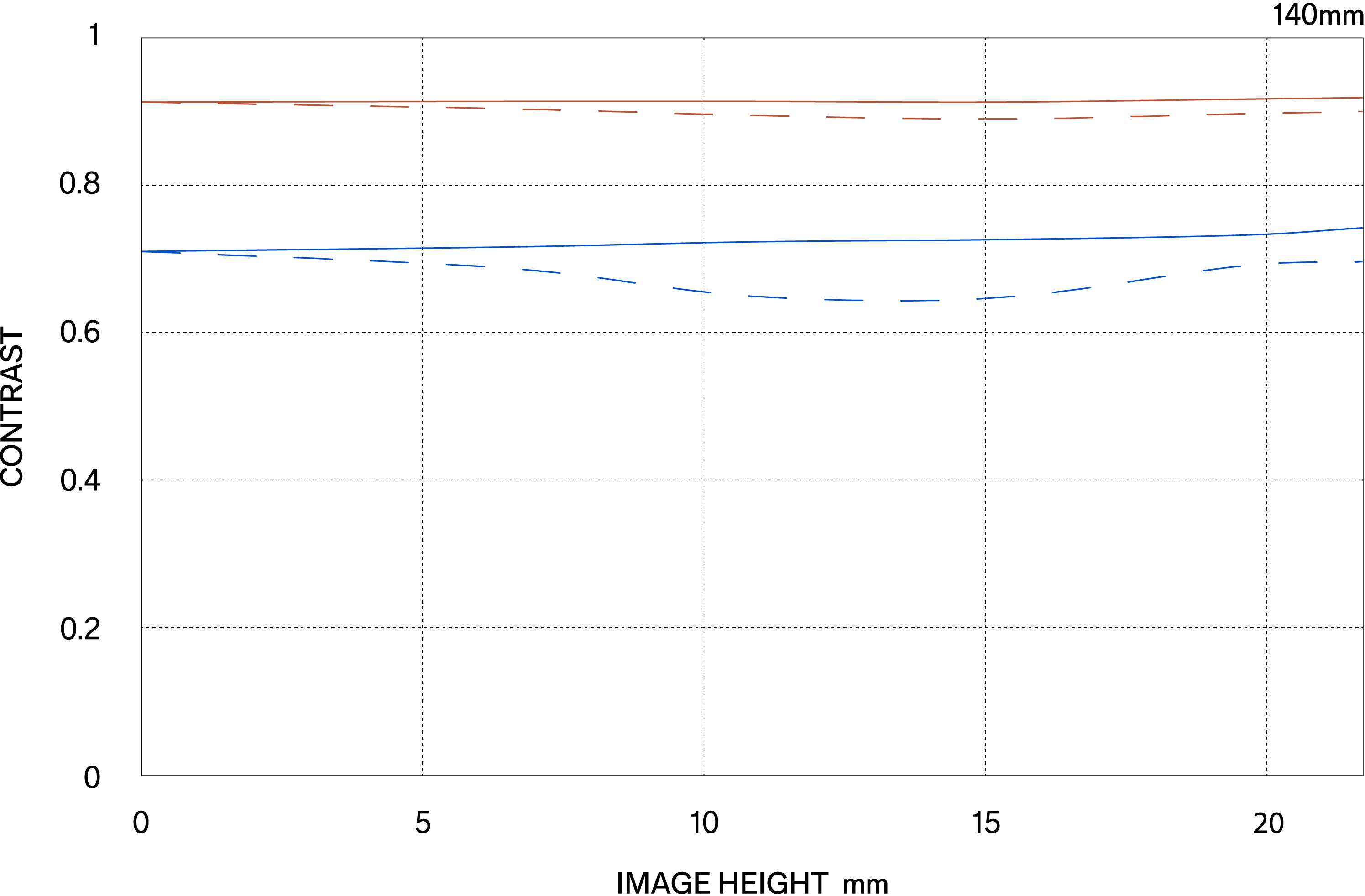 The MTF (Modulation Transfer Function) is one of the measurements for evaluating a lens’ performance, and it shows how faithfully the contrast of the subject can be reproduced on the image plane. The horizontal axis shows the image height (distance from the center of the image in mm) and the vertical axis shows the contrast value (maximum value is 1).