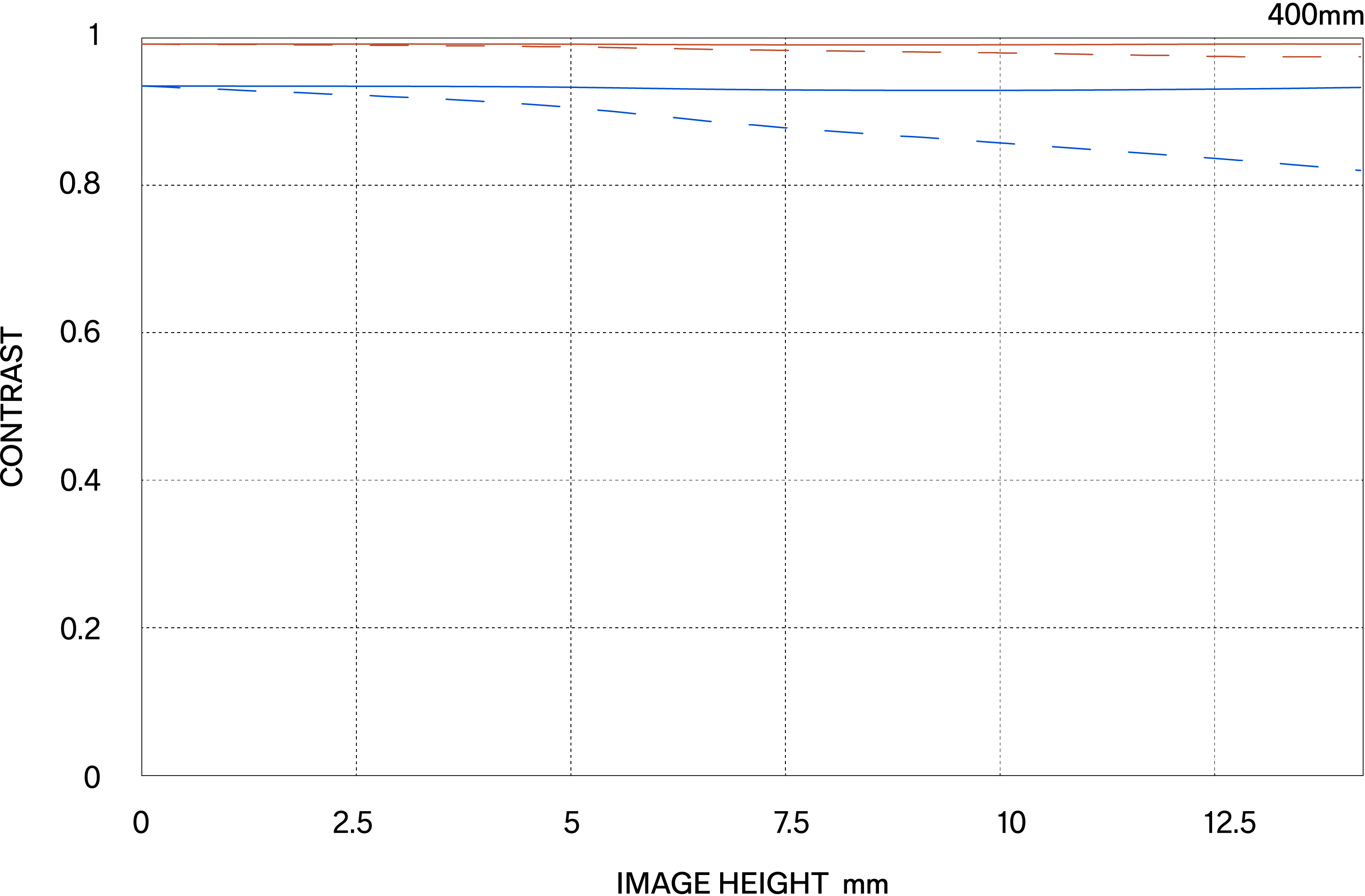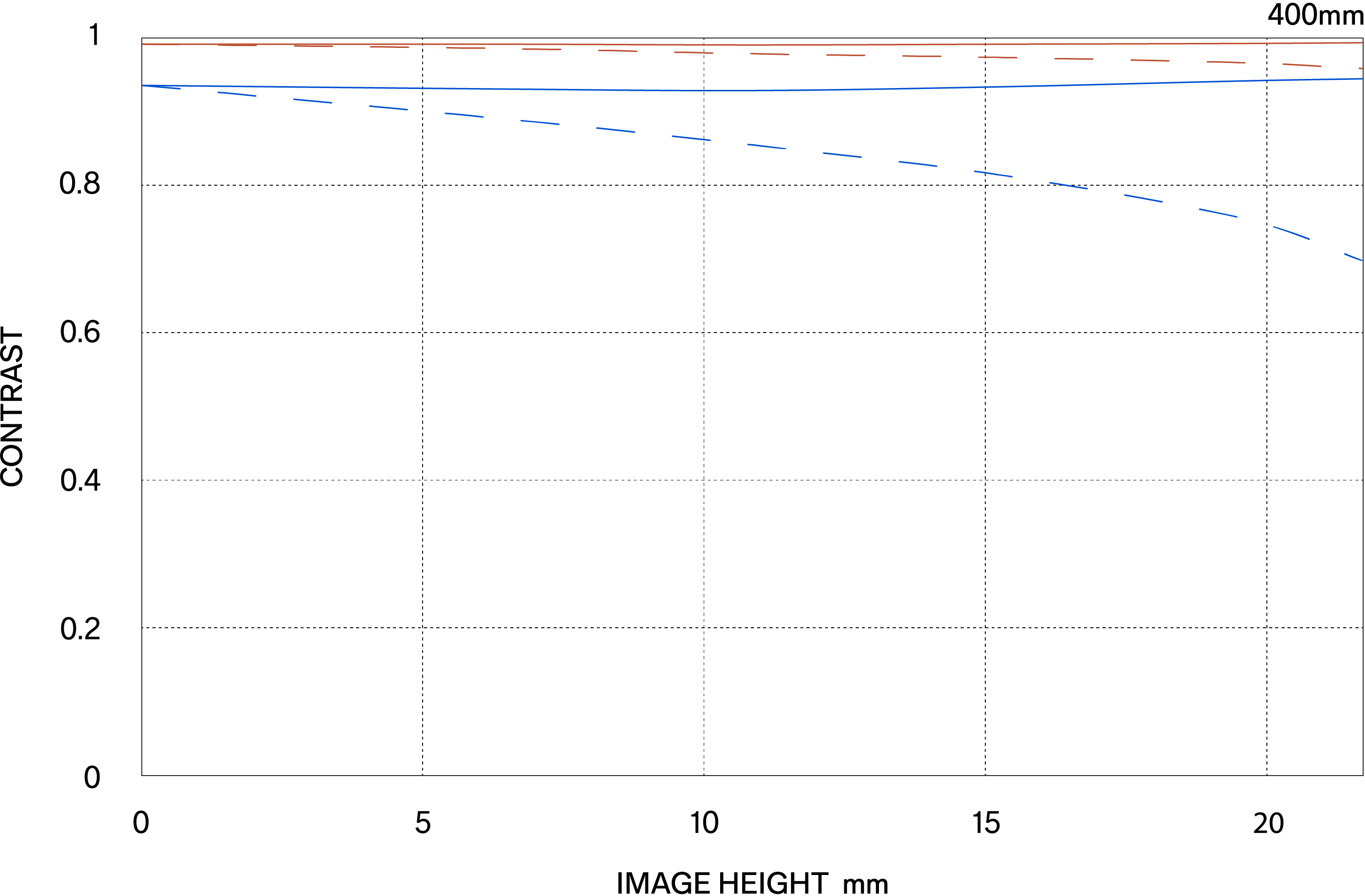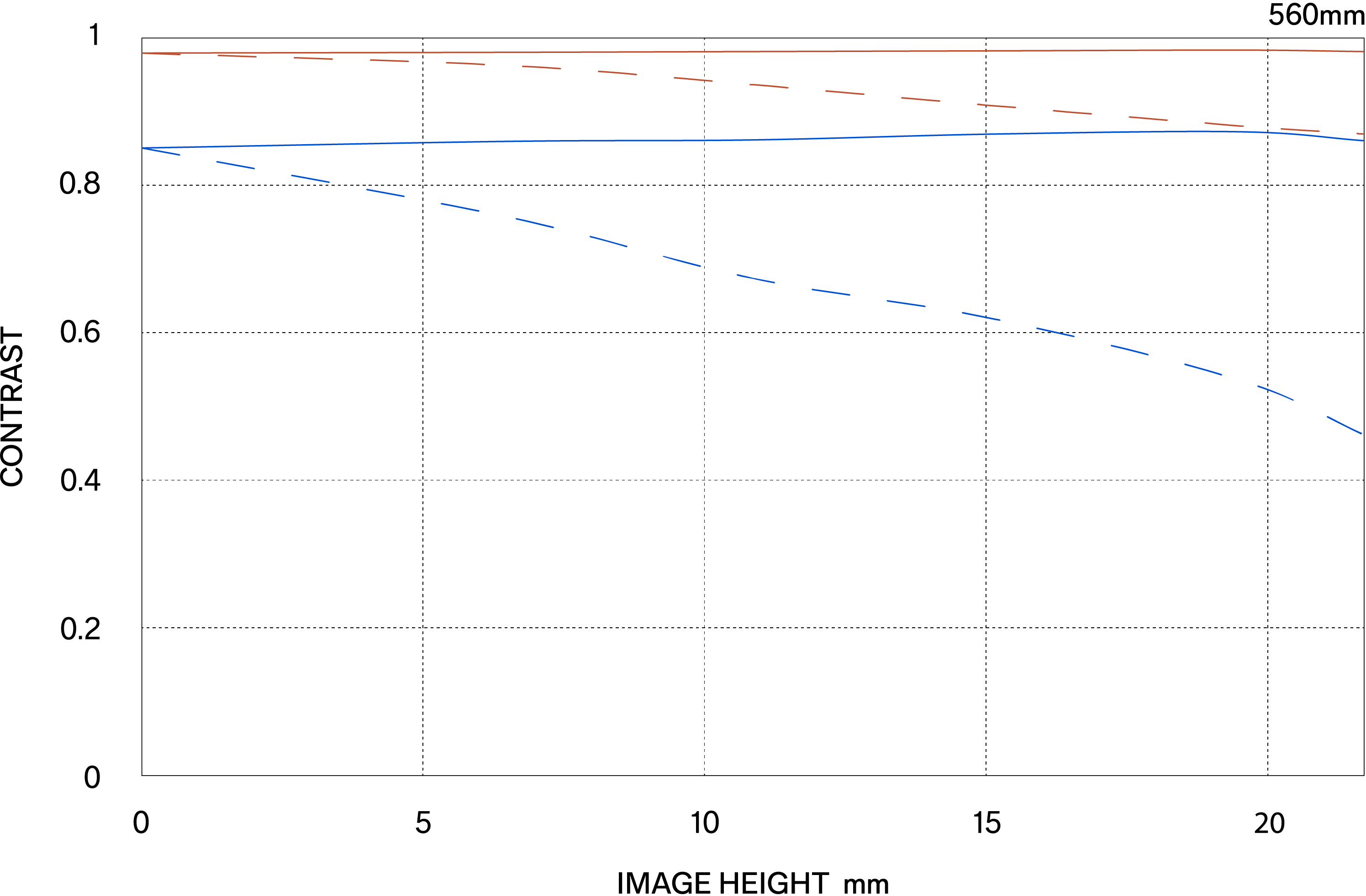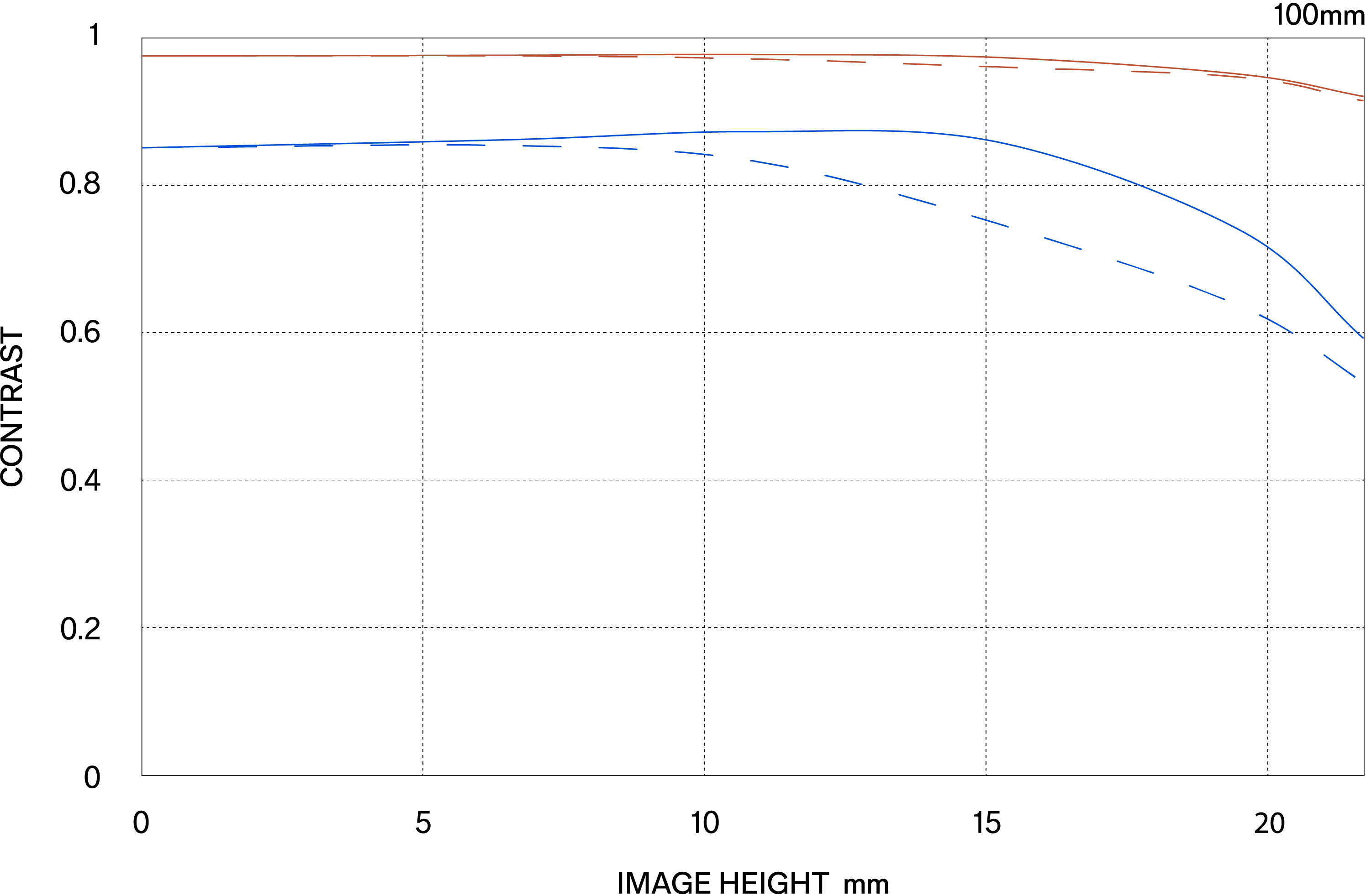 The MTF (Modulation Transfer Function) is one of the measurements for evaluating a lens’ performance, and it shows how faithfully the contrast of the subject can be reproduced on the image plane. The horizontal axis shows the image height (distance from the center of the image in mm) and the vertical axis shows the contrast value (maximum value is 1).