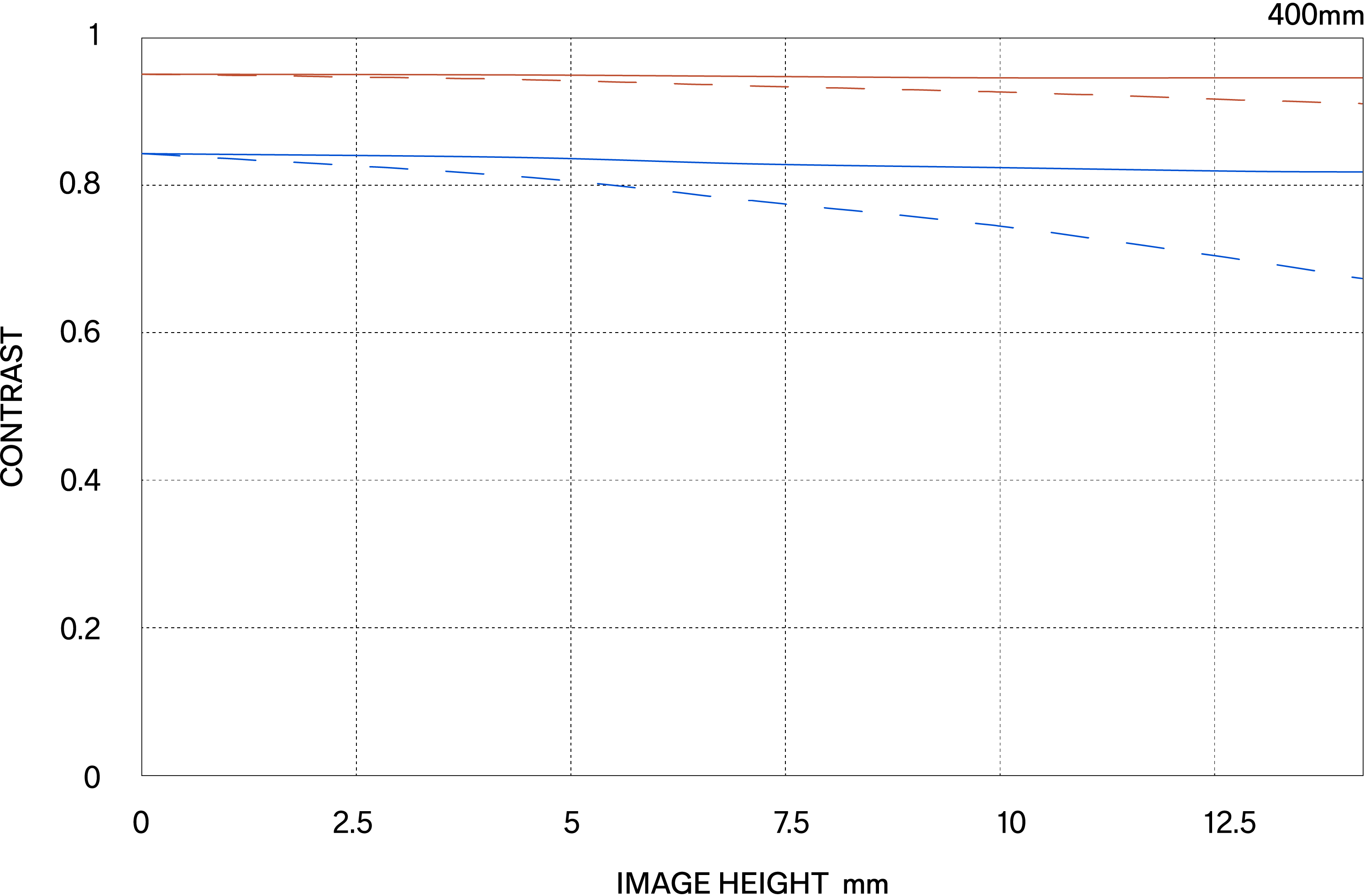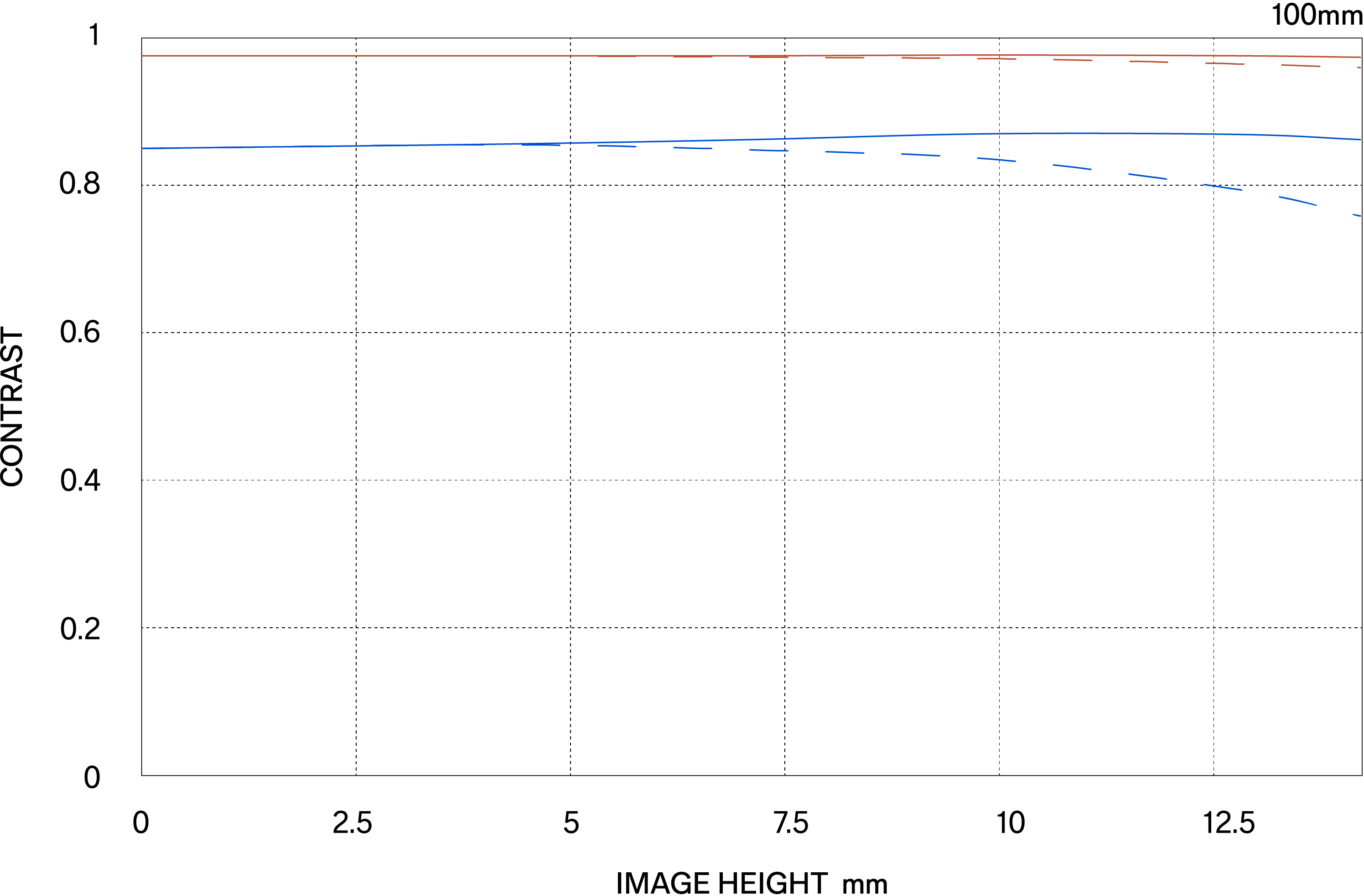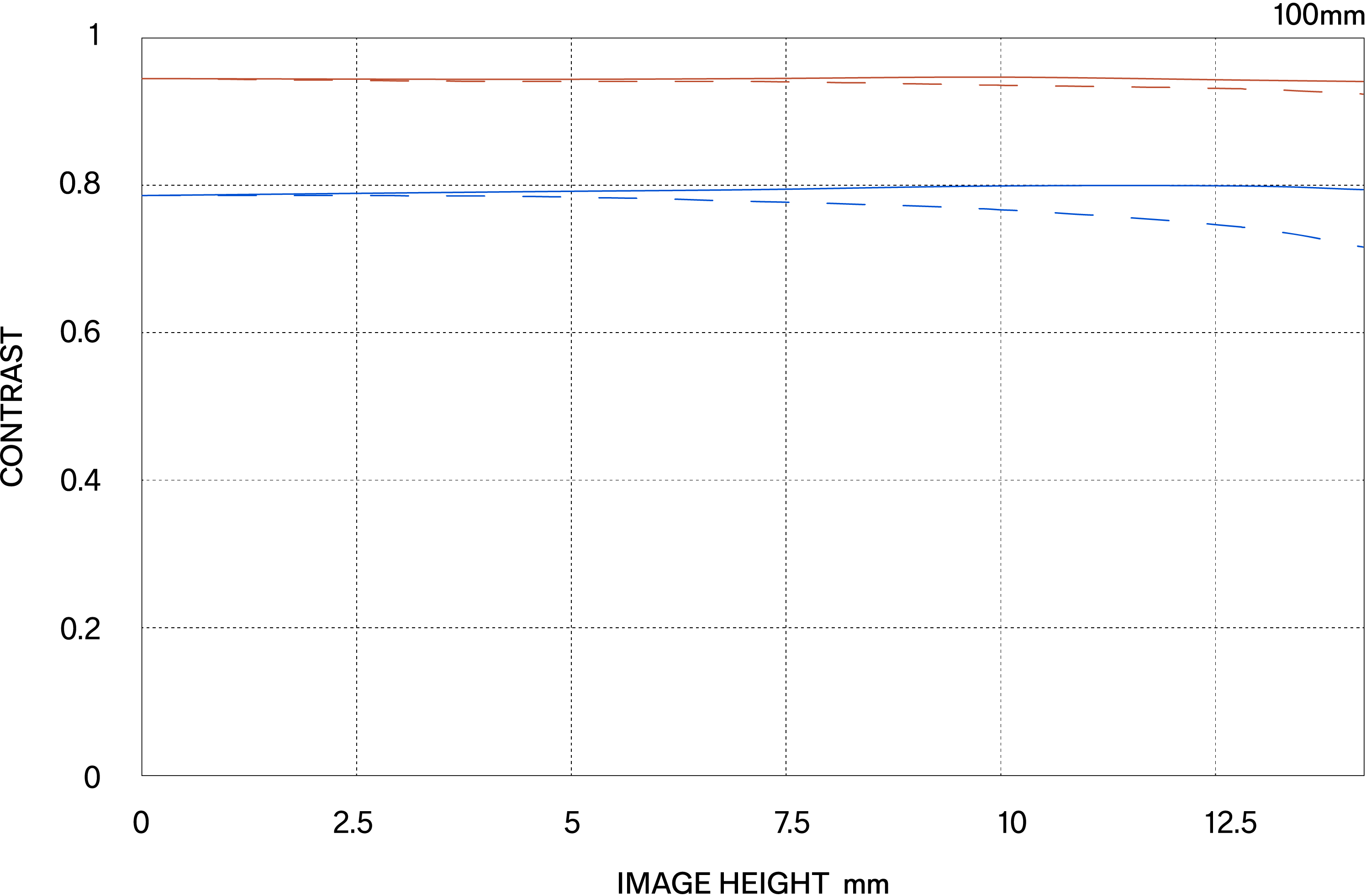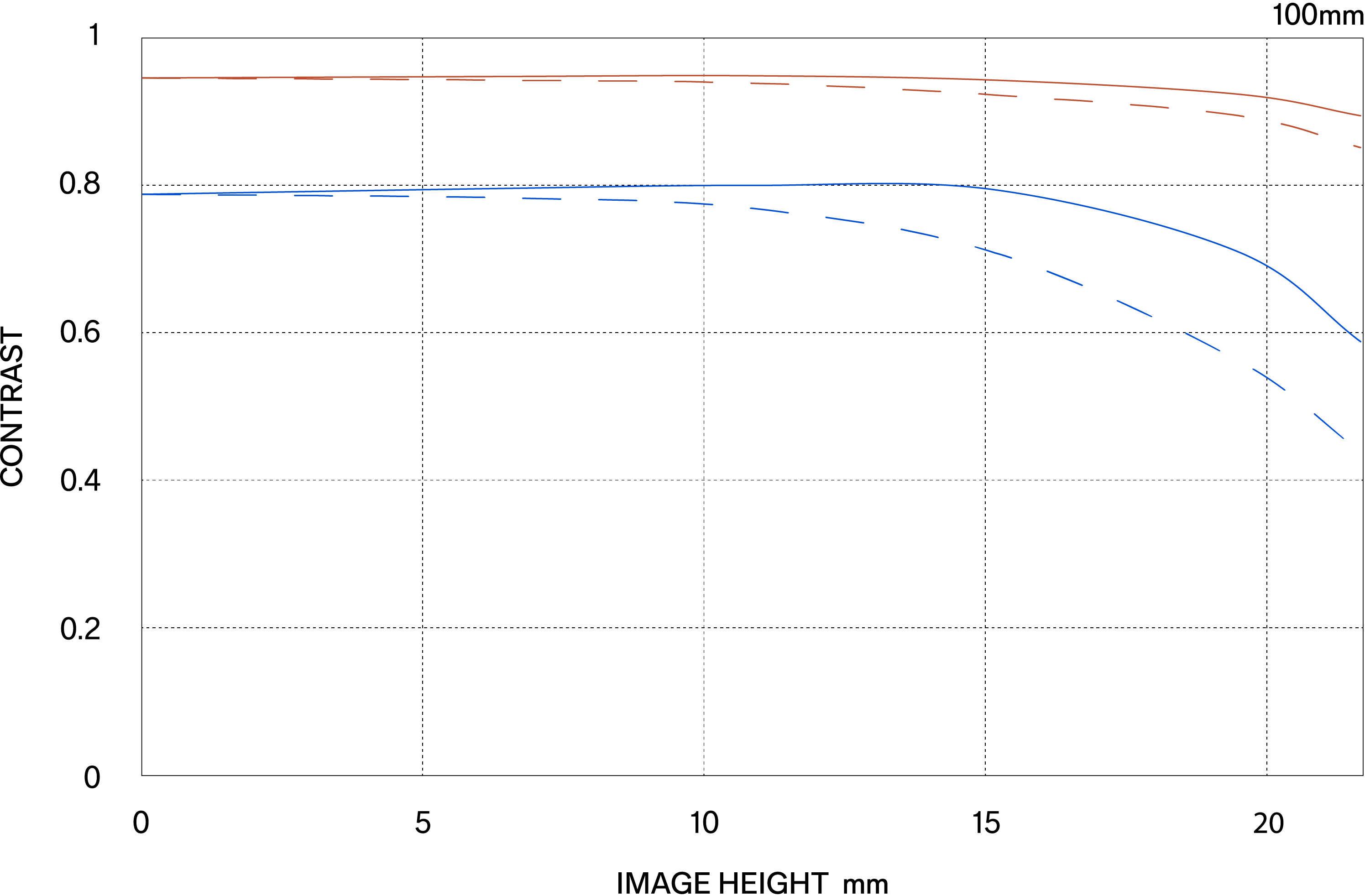 The MTF (Modulation Transfer Function) is one of the measurements for evaluating a lens’ performance, and it shows how faithfully the contrast of the subject can be reproduced on the image plane. The horizontal axis shows the image height (distance from the center of the image in mm) and the vertical axis shows the contrast value (maximum value is 1).